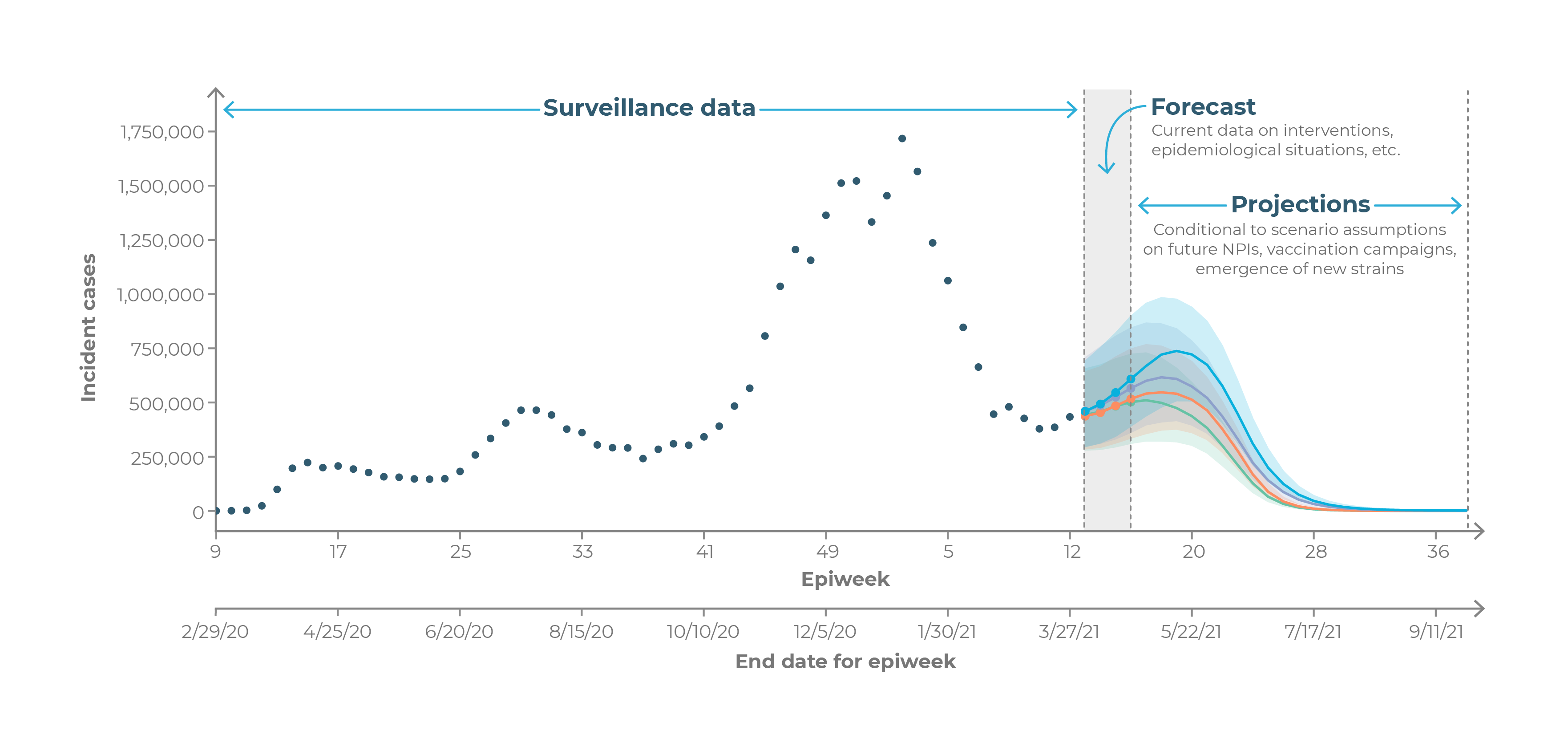 Even the best models of emerging infections struggle to give accurate forecasts at time scales greater than 3-4 weeks due to unpredictable drivers such as a changing policy environment, behavior change, the development of new control measures, and stochastic events. However, policy decisions around the course of emerging infections often require projections in the time frame of months. The goal of long-term projections is to compare outbreak trajectories under different scenarios, as opposed to offering a specific, unconditional estimate of what “will” happen.