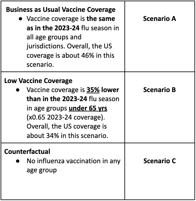 • Estimates of vaccine benefits should be interpreted in light of a high assumed VE against hospitalizations (50%), which anticipates a good match between circulating viruses and vaccine strains. Further, projections assume a high vaccine uptake among individuals over 65 yrs who suffer higher hospitalization and death burden. Lastly, indirect vaccine benefits are theoretically amplified in low influenza transmission seasons and most models project a fair probability of a low transmission season.