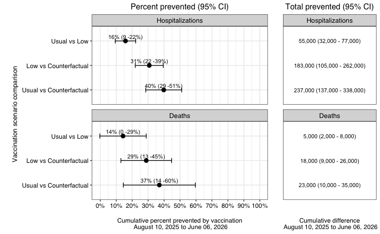 • In the business-as-usual vaccination scenario, cumulative burden for this season is projected to reach 315,000 (95% PI: 68,000-680,000) hospitalizations and 35,000 (95% PI: 13,000-48,000) deaths.